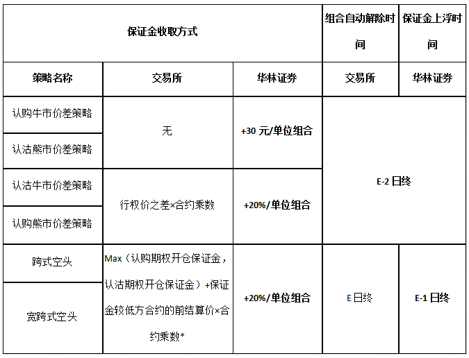 (1) 对于认购牛市价差策略和认沽熊市价差策略,每单位组合在交易所保证金的基础上加收30元保证金。E-2日日终(注:E日为合约到期日)交易所对组合持仓进行自动解除,并对组合成分持仓收取维持保证金。我司对认购牛市价差策略和认沽熊市价差策略不提前上浮保证金,E-2日日终清算后我司按照组合解除后成分合约公司标准收取维持保证金保证金。